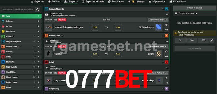 O 0777bet oferece uma grande seleção de opções de apostas em e-sports com probabilidades competitivas